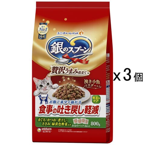 de20_unigpd _neko 銀のスプーン 食事の吐き戻し軽減フード まぐろ・かつお・煮干し・ささみ・緑黄色野菜入り 800g小分けパック4袋入 4520699663455 ユニチャーム株式会社 ユニ・チャーム YMYM 猫用フード キャットフード 総合栄養食 成猫用 ドライフード ト まぐろ 鶏 ささみ ビーフ チーズ 野菜 毛玉ケア 毛玉 吐き戻し nc_ginsupu_dry1 カリカリ 嘔吐 ゲロフード neko_gero_food p15ginsp ×3袋 20220128 y22m01 mikari catday22unch ドライ フード