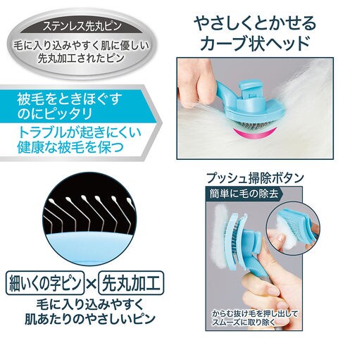| 特長 | ●毛をすき取ってスッキリ・清潔!被毛をときほぐすのにピッタリのブラシです。 ●毛に入り込みやすい細いくの字ピンと、先丸加工が肌に優しいステンレスピンで抜け毛を取り除き、もつれ・毛玉をほぐす、ほこり・汚れ等の取り除き、トラブルが起きにくい健康な被毛を保てます。 ●優しくとかせるカーブ状ヘッドとすべりにくいラバーハンドルでお手入れも楽々です。 ●ピンに絡む毛が簡単に取れるプッシュ掃除ボタンでお手入れ後も簡単です。 |