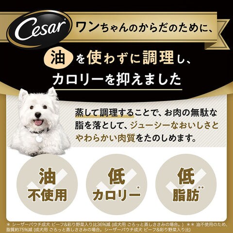 | 特長 | ●低脂肪なささみをふっくら蒸して低カロリーに仕上げました。(シーザーパウチ成犬 ビーフ&彩り野菜入り比28%減) ●丁寧な調理で素材のおいしさをそのまま閉じ込めました。 |