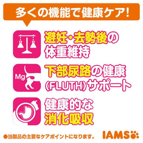 | 特長 | ●避妊・去勢後の健康維持が気になる猫ちゃんにおすすめの総合栄養食です。 ●太りやすい避妊・去勢後に配慮し、脂質38%オフ*。健康的な体重維持をサポートします。(*アイムス成猫用毛玉ケア比) ●マグネシウムを含むバランスのとれたミネラルの配合により、下部尿路の健康維持をサポートします。 |