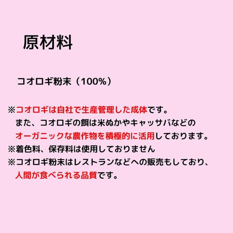 | 原料 | コオロギ粉末(100%) ※原産国:カンボジア(自社で主原料のコオロギを生産しています。また、コオロギの餌は米ぬかなどのオーガニックな農作物を積極的に活用しております。) ※着色料、保存料は使用しておりません。 ※コオロギ粉末はレストランなどへの販売もしており、人間が食べられる品質です。しかし、本商品は人間が食べることを想定したものではありません。 |