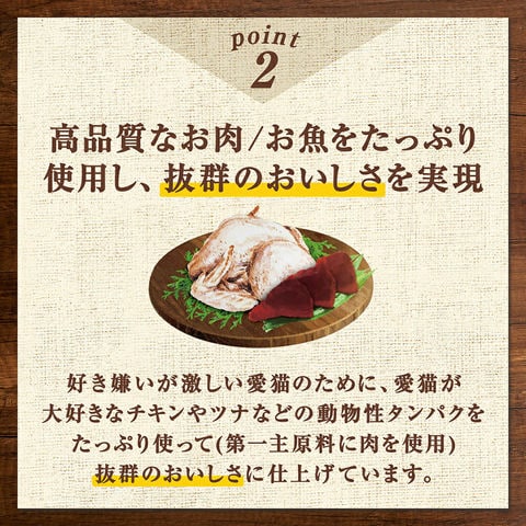 本品は、AAFCO(米国飼料検査官協会)規定の分析試験により、愛猫の健康維持に適したバランスの良い総合栄養食であることが証明されています。