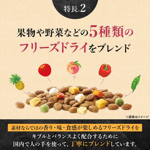 | 特長 | ●5種類の果物と野菜のフリーズドライとキブル(粒)がブレンドされたドッグフードです。 ●フリーズドライにすることで、素材が持つ味、香り、風味及び熱に弱いビタミン類などの栄養素を損なわずに、素材を活かしたおいしさと栄養バランスをお届けします。 ●キブルと5種類の果物と野菜のフリーズドライが適切なバランスで均一に混ざるように、国内で人の手を使って丁寧にブレンドしています。 |