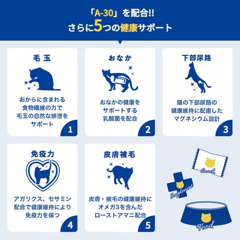 | 原材料 | <11歳以上> ●室内猫用 トウモロコシ、グルテンミール、チキン、ビーフ、ポーク、動物性油脂、小麦粉、フィッシュエキス、ローストアマニ、食物繊維、植物性油脂、酵母、チキンレバーパウダー、 おからパウダー、まぐろ・かつお削りぶしパウダー、乳酸菌、アガリクス、クランベリー、セサミン、ミネラル類(P、Na、Cl、Ca、K、Zn、Fe、Cu、Co、Mn、I)、 アミノ酸類(シスチン、メチオニン、タウリン)、ビタミン類(A、B1、B2、B6、B12、C、D3、E、K3、コリン、ニコチン酸、パントテン酸、ビオチン、葉酸)、調味料、 酸化防止剤(ミックストコフェロール、ハーブ抽出物) ●室内避妊・去勢後猫用 トウモロコシ、グルテンミール、チキン、ビーフ、ポーク、動物性油脂、小麦粉、フィッシュエキス、ローストアマニ、食物繊維、植物性油脂、酵母、チキンレバーパウダー、 おからパウダー、まぐろ・かつお削りぶしパウダー、乳酸菌、アガリクス、クランベリー、セサミン、ミネラル類(P、Na、Cl、Ca、K、Zn、Fe、Cu、Co、Mn、I)、 アミノ酸類(シスチン、メチオニン、タウリン)、ビタミン類(A、B1、B2、B6、B12、C、D3、E、K3、コリン、ニコチン酸、パントテン酸、ビオチン、葉酸)、調味料、 酸化防止剤(ミックストコフェロール、ハーブ抽出物) ●室内猫用 フィッシュ トウモロコシ、グルテンミール、チキンミール、小麦粉、動物性油脂、フィッシュミール、ビーフミール、ポークミール、フィッシュエキス、食物繊維、植物性油脂、酵母、まぐろ・かつお削りぶしパウダー、ローストアマニ、乳酸菌、アガリクス、セサミン、クランベリー、ミネラル類(Na、Cl、Ca、P、K、Zn、Fe、Cu、Co、Mn、I)、アミノ酸類(シスチン、メチオニン、タウリン)、ビタミン類(A、B1、B2、B6、B12、C、D3、E、K3、コリン、ニコチン酸、パントテン酸、ビオチン、葉酸)、調味料、酸化防止剤(ミックストコフェロール、ハーブ抽出物) ●室内避妊・去勢後猫用 フィッシュ トウモロコシ、グルテンミール、チキンミール、小麦粉、動物性油脂、フィッシュミール、ビーフミール、ポークミール、フィッシュエキス、食物繊維、植物性油脂、酵母、まぐろ・かつお削りぶしパウダー、ローストアマニ、乳酸菌、アガリクス、セサミン、クランベリー、ミネラル類(Na、Cl、Ca、P、K、Zn、Fe、Cu、Co、Mn、I)、アミノ酸類(シスチン、メチオニン、タウリン)、ビタミン類(A、B1、B2、B6、B12、C、D3、E、K3、コリン、ニコチン酸、パントテン酸、ビオチン、葉酸)、調味料、酸化防止剤(ミックストコフェロール、ハーブ抽出物) <15歳以上> ●室内猫用 トウモロコシ、グルテンミール、チキン、ビーフ、ポーク、動物性油脂、小麦粉、フィッシュエキス、ローストアマニ、食物繊維、植物性油脂、酵母、チキンレバーパウダー、 おからパウダー、まぐろ・かつお削りぶしパウダー、乳酸菌、アガリクス、クランベリー、セサミン、ミネラル類(P、Na、Cl、Ca、K、Zn、Fe、Cu、Co、Mn、I)、 アミノ酸類(シスチン、メチオニン、タウリン)、ビタミン類(A、B1、B2、B6、B12、C、D3、E、K3、コリン、ニコチン酸、パントテン酸、ビオチン、葉酸)、調味料、 酸化防止剤(ミックストコフェロール、ハーブ抽出物) ●室内猫用 フィッシュ トウモロコシ、グルテンミール、チキンミール、小麦粉、動物性油脂、フィッシュミール、ビーフミール、ポークミール、フィッシュエキス、食物繊維、植物性油脂、酵母、まぐろ・かつお削りぶしパウダー、ローストアマニ、乳酸菌、アガリクス、セサミン、クランベリー、ミネラル類(Na、Cl、Ca、P、K、Zn、Fe、Cu、Co、Mn、I)、アミノ酸類(シスチン、メチオニン、タウリン)、ビタミン類(A、B1、B2、B6、B12、C、D3、E、K3、コリン、ニコチン酸、パントテン酸、ビオチン、葉酸)、調味料、酸化防止剤(ミックストコフェロール、ハーブ抽出物) <20歳> ●室内猫用 トウモロコシ、グルテンミール、チキン、ビーフ、ポーク、動物性油脂、小麦粉、フィッシュエキス、ローストアマニ、食物繊維、植物性油脂、酵母、チキンレバーパウダー、 おからパウダー、まぐろ・かつお削りぶしパウダー、乳酸菌、アガリクス、クランベリー、セサミン、ミネラル類(P、Na、Cl、Ca、K、Zn、Fe、Cu、Co、Mn、I)、 アミノ酸類(シスチン、メチオニン、タウリン)、ビタミン類(A、B1、B2、B6、B12、C、D3、E、K3、コリン、ニコチン酸、パントテン酸、ビオチン、葉酸)、調味料、 酸化防止剤(ミックストコフェロール、ハーブ抽出物) ●室内猫用 フィッシュ トウモロコシ、グルテンミール、チキンミール、小麦粉、動物性油脂、フィッシュミール、ビーフミール、ポークミール、フィッシュエキス、食物繊維、植物性油脂、酵母、まぐろ・かつお削りぶしパウダー、ローストアマニ、乳酸菌、アガリクス、セサミン、クランベリー、ミネラル類(Na、Cl、Ca、P、K、Zn、Fe、Cu、Co、Mn、I)、アミノ酸類(シスチン、メチオニン、タウリン)、ビタミン類(A、B1、B2、B6、B12、C、D3、E、K3、コリン、ニコチン酸、パントテン酸、ビオ