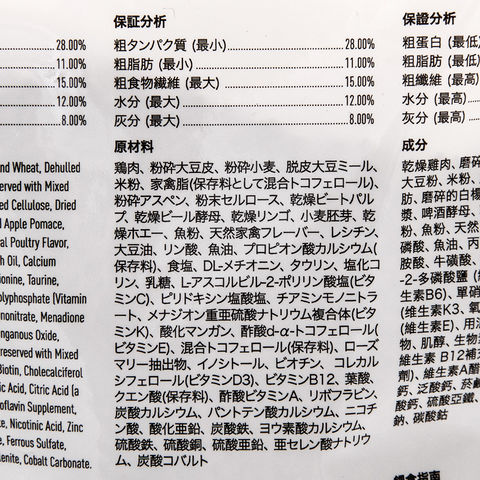 | 原材料 | 鶏肉、粉砕大豆皮、粉砕小麦、脱皮大豆ミール、米粉、家禽脂(保存料として混合トコフェロール)、粉砕アスペン、粉末セルロース、乾燥ビートパルプ、乾燥ビール酵母、乾燥リンゴ、小麦胚芽、乾燥ホエー、魚粉、天然家禽フレーバー、レシチン、大豆油、リン酸、魚油、プロピオン酸カルシウム(保存料)、食塩、DL-メチオニン、タウリン、塩化コリン、乳糖、L-アスコルビル-2-ポリリン酸塩(ビタミンC)、ピリドキシン塩酸塩、チアミンモノニトラート、メナジオン重亜硫酸ナトリウム複合体(ビタミンK)、酸化マンガン、酢酸d-α-トコフェロール(ビタミンE)、混合トコフェロール(保存料)、ローズマリー抽出物、イノシトール、ビオチン、コレカルシフェロール(ビタミンD3)、ビタミンB12、葉酸、クエン酸(保存料)、酢酸ビタミンA、リボフラビン、炭酸カルシウム、パントテン酸カルシウム、ニコチン酸、酸化亜鉛、炭酸鉄、ヨウ素酸カルシウム、硫酸鉄、硫酸銅、硫酸亜鉛、亜セレン酸ナトリウム、炭酸コバルト |