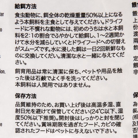 | ご注意 | ※本品は食虫動物用のフードです。目的以外の用途では使用しないでください。 |