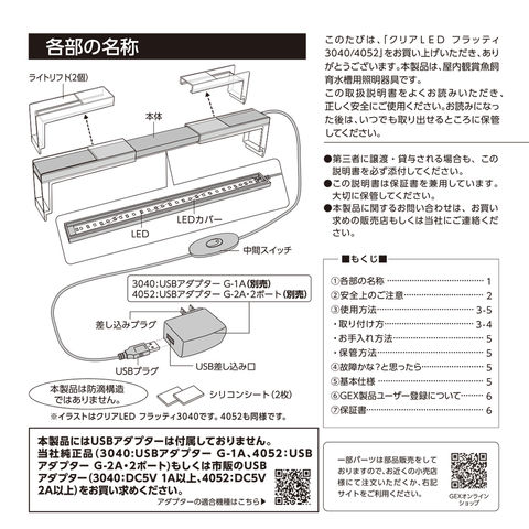 | 仕様 | ●定格電圧/消費電力:DC5V/4W ●アダプター使用時の消費電力:AC100V 6.5W ●明るさ:300lm ●色温度:6,800K ●演色性:Ra83 ●使用アダプター(別売り):USBアダプターG-1A 入力:AC100V 出力:DC5V 1A ●適合水槽:水槽幅30~40cm |
