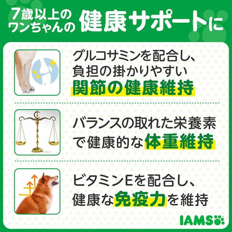 | 特長 | ●高齢わんちゃんに適した栄養を摂ることが出来る総合栄養食です。 ●グルコサミンを配合し、シニア期に負担のかかりやすい関節の健康維持をサポートします。 ●バランスの取れた栄養バランスで、健康的な体重維持をサポートします。 ●バランスのとれた栄養素の一つとして、ビタミンEとβ-カロテンを配合しています。 ●カリカリの粒を噛むことで、歯垢の蓄積を抑えます。 オメガ-6脂肪酸(チキンオイル由来)とオメガ-3脂肪酸(フィッシュオイル由来)の働きで、健やかな皮膚と輝く毛並みの健康をサポートします。 ●健康的な消化吸収に配慮してプレバイオティクス*や食物繊維(ビートパルプ)を配合しました(*フラクトオリゴ糖を使用)。 |