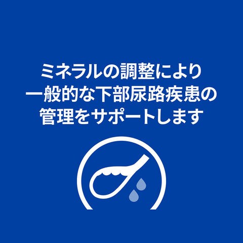 | 特長 | ●ミネラル、尿pHの調整により、愛犬の下部尿路をケアし、ストルバイト結石とシュウ酸カルシウム結石の再発リスクを低減する特別療法食です。 ●ストルバイト尿石の溶解時の管理、およびストルバイト尿石、シュウ酸カルシウム尿石の形成に配慮しています。 ●健康的な長期給与に適しています。 ●マグネシウム、カルシウム、リンの含有量を調整し、クエン酸カリウム、オメガ-3脂肪酸を配合。 ●脂肪量を調整し、低ナトリウム。 |