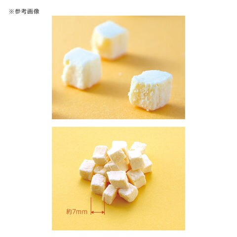 | 特長 | ●国産プロセスチーズをフリーズドライ加工で仕上げた愛犬用おやつです。 ●乾燥チーズ独特の「きしみ」がなく、原料の風合いを活かしてサクサク・クリーミーに仕上げました。 ●毎日の食事のトッピングや、トレーニングのお供にピッタリです。 ●キューブ状で与えやすく、食べやすいサイズです。 ●保存料不使用で安心の国産おやつです。 |