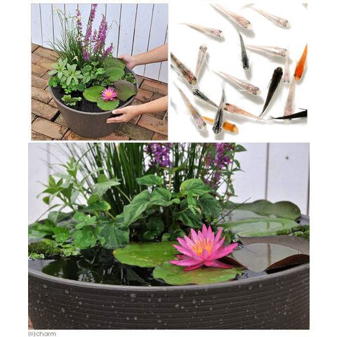 スイレンと相性の良いメダカや浮き草、さらに寄せ植えもセットにしました!