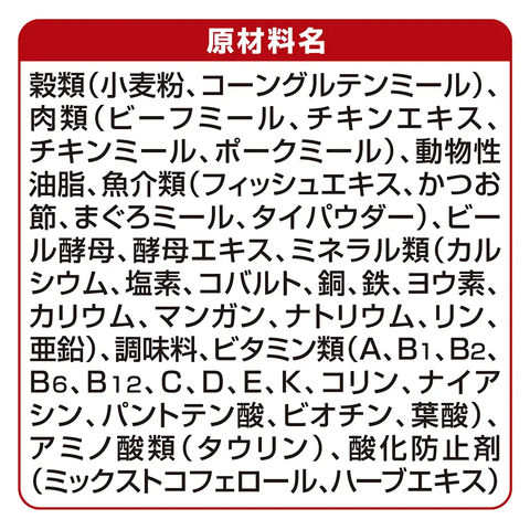 | 原材料 | 穀類(小麦粉、コーングルテンミール)、肉類(ビーフミール、チキンエキス、チキンミール、ポークミール)、動物性油脂、魚介類(フィッシュエキス、かつお節、まぐろミール、タイパウダー)、ビール酵母、酵母エキス、ミネラル類(カルシウム、塩素、コバルト、銅、鉄、ヨウ素、カリウム、マンガン、ナトリウム、リン、亜鉛)、調味料、ビタミン類(A、B1、B2、B6、B12、C、D、E、K、コリン、ナイアシン、パントテン酸、ビオチン、葉酸)、アミノ酸類(タウリン)、酸化防止剤(ミックストコフェロール、ハーブエキス) |