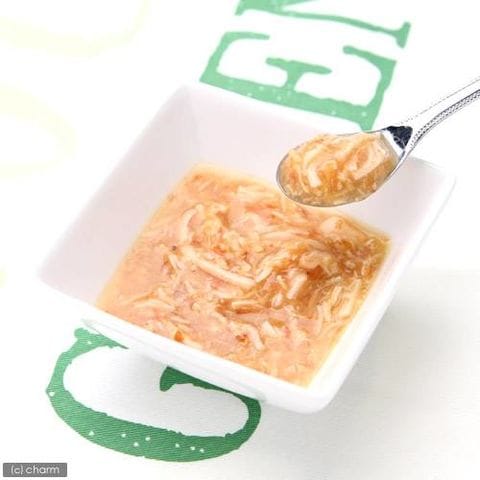 | 原材料 | 鶏肉(ささみ)、かに風味かまぼこ、ほたてエキス、かつお節、糖類(オリゴ糖等)、植物性油脂、増粘剤(加工でん粉)、ミネラル類、増粘多糖類、調味料(アミノ酸等)、ビタミンE、カラメル色素、緑茶エキス、カロテノイド色素 |