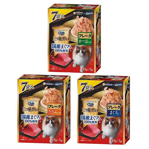 | セット内容 | ●三ツ星グルメ パウチ 国産まぐろ100%使用 フレーク かつお入り(35g×7袋)×1個 ●三ツ星グルメパウチ 国産まぐろ100%使用フレークまぐろ(35g×7袋)×1個 ●三ツ星グルメパウチ 国産まぐろ100%使用フレークささみ入り(35g×7袋)×1個 |