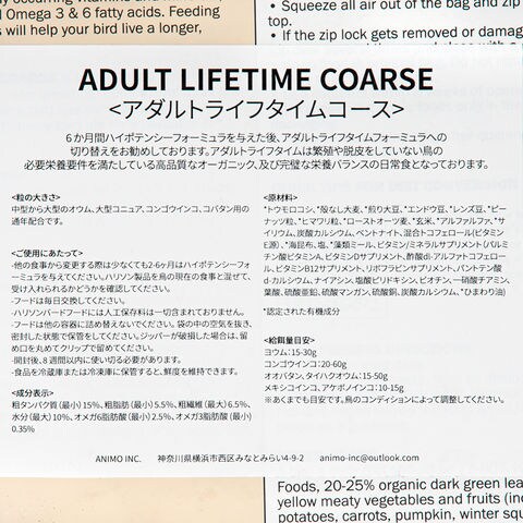 | 特長 | ●オウムインコ類の成鳥の常用食として高品質かつ完璧なバランスのフードです。 ●ヨウム、コンゴウインコ、タイハクオウム、コバタンなど中型から大型の鳥に適した大きさです。 |