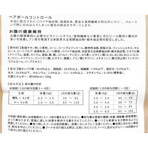 原材料 乾燥チキン粉、小麦粉、コーン、コーングルテンミール、動物性油脂、脱脂大豆、フィッシュエキス、セルロース、ビートパルプ、海藻粉末、ビール酵母、パパイヤ抽出物、米胚芽大豆発酵抽出物・樹木抽出物、ミネラル類(ナトリウム、塩素、カリウム、亜鉛、鉄、銅、コバルト、マンガン、ヨウ素)、ビタミン類(A、B1、B2、B6、B12、C、D、E、K、コリン、ナイアシン、パンテトン酸、ビオチン、葉酸)、アミノ酸(タウリン、メチオニン)、酸化防止剤(ミックストコフェロール、ハーブエキス)