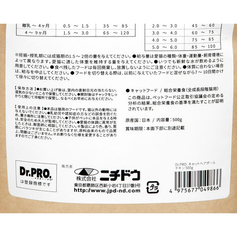 4975677049866 キャットフード ドクタープロ 国産 ニチドウ Dr.PRO. キャットヘアボール チキン 500g 猫 フード ネコ ねこ用 猫用 愛猫 愛猫用 CAT ネコフード 猫フード ドライフード ドライ カリカリ 総合栄養食 ヘアボール ヘアボールコントロール パパイヤ抽出物 海藻粉末 食物繊維 被毛 排出サポート 腸内環境 お腹の健康 おなか お腹 ビタミン ミネラル類 20231120 y23m11 Ishina melma2409syouryocat opa2_choku