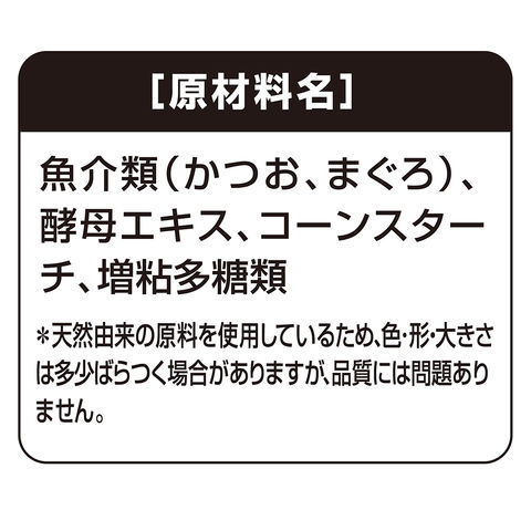| 原材料 | 魚介類(かつお、まぐろ)、酵母エキス、コーンスターチ、増粘多糖類、酵母エキス、コーンスターチ、増粘多糖類 |