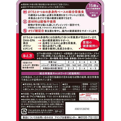 ご注意 ※本品は15歳以上の高齢猫用です。対象年齢以外の猫には与えないでください。