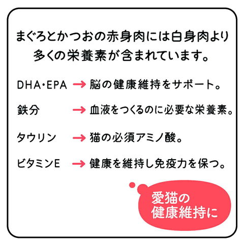 特長 ●DHA、EPA、鉄分、タウリン、ビタミンEを含むまぐろとかつおの赤身肉ベースの総合栄養食です。
