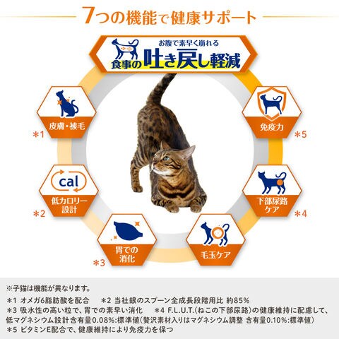 | 特長 | ●食事の吐き戻し軽減を中心とした7つの機能で健康サポートする総合栄養食です。 ●腎臓の健康維持に配慮して、リンを制限した栄養設計(室内猫用比 約80%)、ナトリウムを調整しました。 ●愛猫の健康維持に配慮して、ビタミンB群を強化(室内猫用比 約240%)しました。 ●猫が大好きなフィッシュの旨みが詰まった粒に、挽き小魚と微粉砕したささみフリーズドライをまぶした高い嗜好性です。 ●着色料・香料不使用です。 |