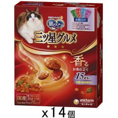 | 原材料 | 穀類(トウモロコシ、コーングルテンミール、小麦粉、パン粉)、肉類(ポークミール、ビーフミール、チキンミール、チキンエキス)、油脂類、魚介類(フィッシュエキス、フィッシュミール、煮干パウダー、鰹節、マグロミール、カツオミール、白身魚ミール、乾燥シラス)、豆類(大豆)、セルロースパウダー、糖類(オリゴ糖)、ビール酵母、酵母エキス、ミネラル類(カルシウム、塩素、コバルト、銅、鉄、ヨウ素、カリウム、マンガン、リン、亜鉛)、ビタミン類(A、B1、B2、B6、B12、C、D、E、K、コリン、ナイアシン、パントテン酸、ビオチン、葉酸)、アミノ酸類(タウリン、メチオニン)、着色料(二酸化チタン、赤色102号、赤色106号、黄色4号、黄色5号)、調味料、酸化防止剤(ミックストコフェロール、ハーブエキス) |