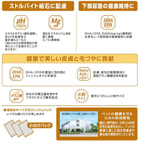 | 特長 | ●下部尿路の健康維持に配慮した総合栄養食です。 ●マグネシウムの含有量を調整し、成長段階に合わせて尿pHを適正にコントロールするバランス設計しています。 ●美しい皮膚と毛づやの健康維持をサポートします。 |