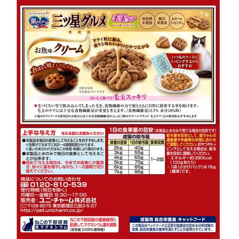 メーカー画像 銀のスプーン 三ツ星グルメ お魚味クリーム毛玉ケア180g 4520699686935 2250003042639 20240126 y24m01 Y.K. 猫 ねこ 猫用 ねこ用 キャット cat 猫フード キャットフード ペットフード フード 餌 エサ ごはん ドライフード ドライ 総合栄養食 ユニチャーム ユニ・チャーム unicharm 成猫 成猫用 国産 日本産 まぐろ かつお 肉 チキン ビーフ ポーク 小分け パック