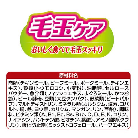 | 原材料 | 肉類(チキンミール、ビーフミール、ポークミール、チキンエキス)、穀類(トウモロコシ、小麦粉)、油脂類、セルロースパウダー、魚介類(フィッシュエキス、まぐろミール、 かつお節)、ビール酵母、豆類(大豆タンパク)、野菜類(ビートパルプ)、マルトデキストリン、ミネラル類(カルシウム、塩素、コバルト、銅、鉄、ヨウ素、カリウム、マンガン、 リン、亜鉛)、調味料、ビタミン類(A、B1、B2、B6、B12、C、D、E、K、コリン、ナイアシン、パントテン酸、ビオチン、葉酸)、 アミノ酸類(タウリン)、酸化防止剤(ミックストコフェロール、ハーブエキス) |
