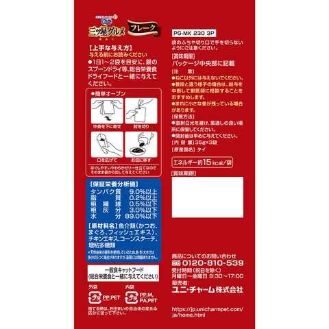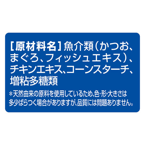 | 原材料 | 魚介類(かつお、まぐろ、フィッシュエキス)、チキンエキス、コーンスターチ、増粘多糖類 ※天然由来の原料を使用しているため、色・形・大きさは多少ばらつく場合がありますが、品質には問題ありません。 |