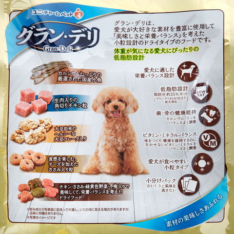 | 特長 | ●愛犬が大好きな素材を豊富に使用しました。 ●体重が気になる愛犬にぴったりの低脂肪設計※です。※脂肪分約35%カット(グラン・デリカリカリ仕立て成犬用比) ●食感を楽しむチーズを加えたささみ入り粒たっぷりです。 ●カルシウムたっぷりの厳選された国産小魚入りです。 ●愛犬が喜ぶ生肉入りの角切りチキン粒、ヘルシーな大豆フレーク入りです。 ●小型犬も食べやすい小粒タイプです。 ●おいしさと風味を逃さない小分けパック入りです。 |