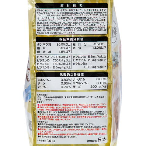 | 成分 | 【保証栄養分析値】 タンパク質:20.0%以上、脂質:6.5%以上、粗繊維:4.5%以下、粗灰分:8.5%以下、水分:13.0%以下、ビタミンA:7500IU/kg以上、ビタミンE:150IU/kg以上、ビタミンB1:2.5mg/kg以上、ビタミンB2:5.5mg/kg以上、ビタミンB6:2.5mg/kg以上、ビタミンB12:0.055mg/kg以上 【代表的な分析値】 カルシウム:0.8%、リン:0.65%、ナトリウム:0.3%、マグネシウム:0.1% |