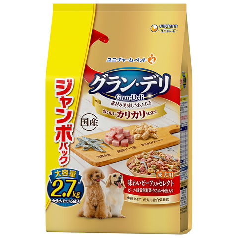 グラン・デリ カリカリ仕立て 成犬用 味わいビーフ入りセレクト ビーフ・緑黄色野菜・ささみ・小魚入り ジャンボパック 2.7kg ×4 2250003046873 4520699631140 20240201 y24m02 Y.K. 犬 いぬ 犬用 いぬ用 ドッグ dog 犬フード ドッグフード ペットフード フード 餌 エサ ごはん ドライフード ドライ 総合栄養食 ユニチャーム ユニ・チャーム unicharm グランデリ 成犬 国産 日本 全犬種 小粒 小魚 角切りビーフ フレーク ササミ ビーフ 牛 カルシウム 小分け カリカリ bnr2511wan2un bnr2511wanall