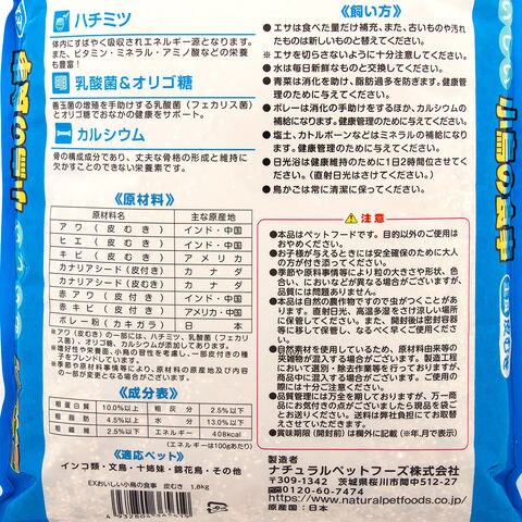 | 原材料 | アワ(皮むき)、ヒエ(皮むき)、キビ(皮むき)、カナリアシード(皮付き)、カナリアシード(皮むき)、赤アワ(皮付き)、赤キビ(皮付き)、ボレー粉(カキガラ) ※アワ(皮むき)の一部には、ハチミツ、乳酸菌(フェリカス菌)、オリゴ糖、カルシウムが添加してあります。 ※嗜好性や栄養面、小鳥の習性を考慮し、一部皮付きの種子をブレンドしています。 |