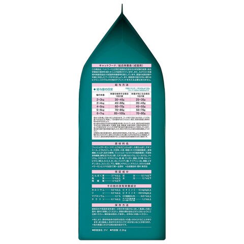 | 原材料 | フィッシュ(サーモン、ツナ)(オメガ3脂肪酸源)、コーングルテン、チキンミール、小麦、食物繊維(ビートパルプ、ライスファイバー、可溶性繊維、セルロース)、米、小麦たんぱく、脱脂大豆、大麦、鶏脂(オメガ6脂肪酸源)、たんぱく加水分解物、フィッシュミール、酵母(βグルカン源)、ミネラル類(カルシウム、リン、カリウム、ナトリウム、クロライド、マグネシウム、鉄、銅、マンガン、亜鉛、ヨウ素、セレン)、カラメル色素、ビタミン類(A、D、E、K、B1、B2、パントテン酸、ナイアシン、B6、葉酸、ビオチン、B12、コリン、C)、アミノ酸類(メチオニン、タウリン) |