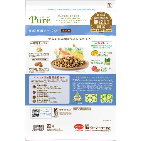 frditem_hidden メーカー画像 ドッグフード コンボ ピュア ドッグ 野菜・厳選チーズ入り 1.6kg(400g×4袋) 4902112008485 20240413 y24m04 mikari 犬 いぬ イヌ 犬用 いぬ用 犬フード 日本ペットフード フード 餌 エサ ごはん 総合栄養食 成犬用 成犬 国産 無添加 日本産 野菜 やさい チキン フリーズドライ オレイン酸 オリーブ オリーブオイル ピュアオイル 小分け チーズ opa2_choku melma2409syouryodog line2410combosmset bnr202411wansnt combopuredog