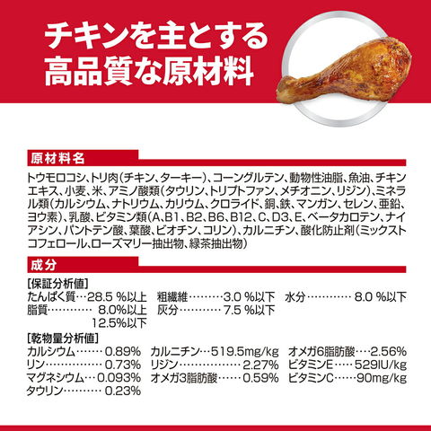 | 保証成分 | たんぱく質:28.5%以上、脂質:8.0%以上12.5%以下、粗繊維:3.0%以下、灰分:7.5%以下、水分:8.0%以下 カルシウム0.89%、リン0.73%、マグネシウム0.093%、タウリン0.23%、カルニチン519.5mg/kg、リジン2.27%、オメガ3脂肪酸0.59%、オメガ6脂肪酸2.56%、ビタミンE529IU/kg、ビタミンC90mg/kg |