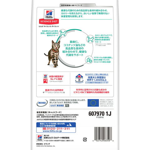| 特長 | ●亜麻仁、ココナッツ油などの高品質な食材の組み合わせで、健康な代謝をサポートします。 ●カロリー約17%*オフで確かな栄養を実現し、理想的な体重管理をサポートします。(*当社「アダルト チキン 成猫用」ドライ製品との比較) ●マグネシウムの量を調整し、適切な栄養バランスで、ストルバイト尿石に配慮しました。 |