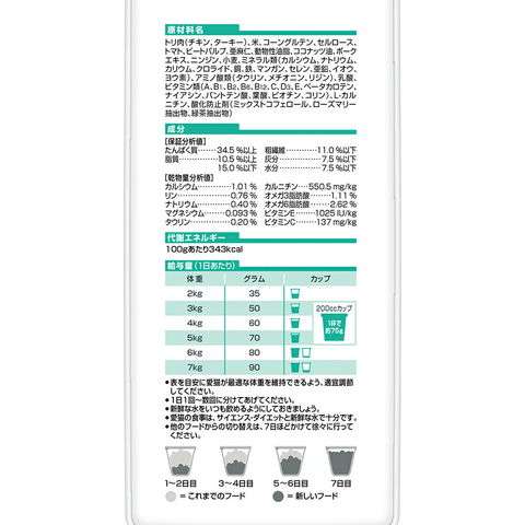 | 原材料 | トリ肉(チキン、ターキー)、米、コーングルテン、セルロース、トマト、ビートパルプ、亜麻仁、動物性油脂、ココナッツ油、ポークエキス、ニンジン、小麦、ミネラル類(カルシウム、ナトリウム、カリウム、クロライド、銅、鉄、マンガン、セレン、亜鉛、イオウ、ヨウ素)、アミノ酸類(タウリン、メチオニン、リジン)、乳酸、ビタミン類(A、B1、B2、B6、B12、C、D3、E、ベータカロテン、ナイアシン、パントテン酸、葉酸、ビオチン、コリン)、カルニチン、酸化防止剤(ミックストコフェロール、ローズマリー抽出物、緑茶抽出物) |