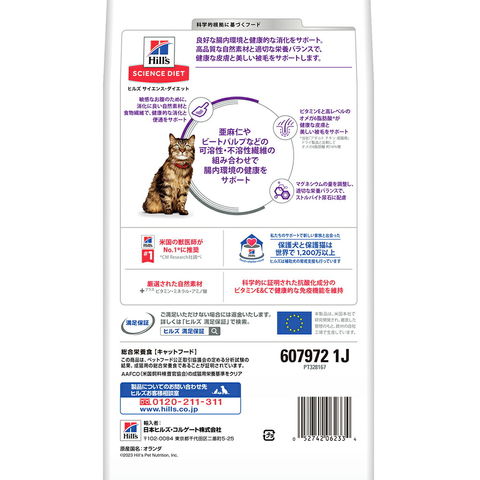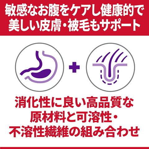 | 特長 | ●ビートパルプや亜麻仁などの可溶性繊維・不溶性繊維の組み合わせで腸内環境の健康をサポートします。 ●敏感なお腹のために、消化に良い原材料と食物繊維を配合し、健康的な消化と便通をサポートします。 ●マグネシウムの量を調整し、適切な栄養バランスで、ストルバイト尿石に配慮しています。 |