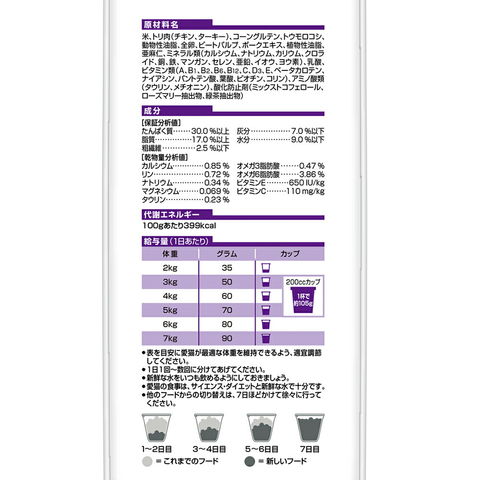 | 原材料 | 米、トリ肉(チキン、ターキー)、コーングルテン、トウモロコシ、動物性油脂、全卵、ビートパルプ、ポークエキス、植物性油脂、亜麻仁、ミネラル類(カルシウム、ナトリウム、カリウム、クロライド、銅、鉄、マンガン、セレン、亜鉛、イオウ、ヨウ素)、乳酸、ビタミン類(A、B1、B2、B6、B12、C、D3、E、ベータカロテン、ナイアシン、パントテン酸、葉酸、ビオチン、コリン)、アミノ酸類(タウリン、メチオニン)、酸化防止剤(ミックストコフェロール、ローズマリー抽出物、緑茶抽出物) |