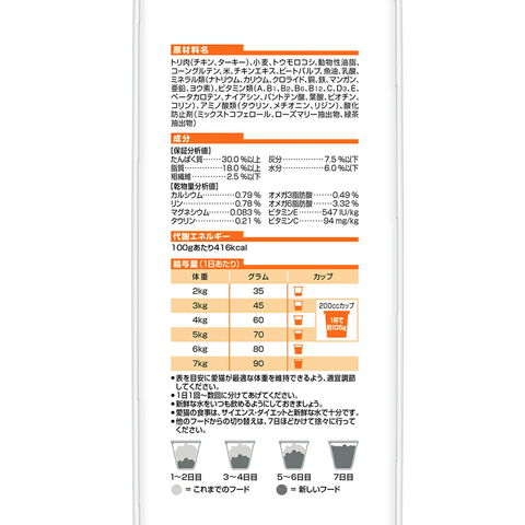 | 保証成分 | たんぱく質:30.0%以上、脂質:18.0%以上、粗繊維:2.5%以下、灰分:7.5%以下、水分:6.0%以下 |