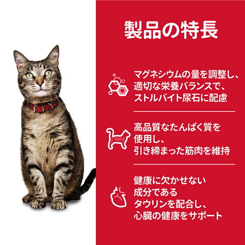 | 特長 | ●マグネシウムの量を調整し、適切な栄養バランスで、ストルバイト尿石に配慮しました。 ●高品質なたんぱく質を使用し、引き締まった筋肉を維持します。 ●健康に欠かせない成分であるタウリンを配合し、心臓の健康をサポートします。 ●ビタミンEとオメガ3&6脂肪酸を含み、健康な皮膚と美しい被毛をサポートします。 |
