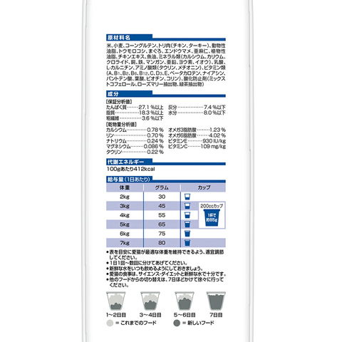 | 原材料 | 米、小麦、コーングルテン、トリ肉(チキン、ターキー)、動物性油脂、トウモロコシ、まぐろ、エンドウマメ、亜麻仁、植物性油脂、チキンエキス、魚油、ミネラル類(カルシウム、カリウム、クロライド、銅、鉄、マンガン、亜鉛、ヨウ素、イオウ)、乳酸、L-カルニチン、アミノ酸類(タウリン、メチオニン)、ビタミン類(A、B1、B2、B6、B12、C、D3、E、ベータカロテン、ナイアシン、パントテン酸、葉酸、ビオチン、コリン)、酸化防止剤(ミックストコフェロール、ローズマリー抽出物、緑茶抽出物) |