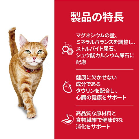 | 特長 | ●マグネシウムの量、ミネラルバランスを調整し、ストルバイト尿石、シュウ酸カルシウム尿石に配慮しました。 ●健康に欠かせない成分であるタウリンを配合し、心臓の健康をサポートします。 ●高品質な原材料と食物繊維で健康的な消化をサポートします。 ●ビタミンEとオメガ3&6脂肪酸を含み、健康な皮膚と美しい被毛をサポートします。 |