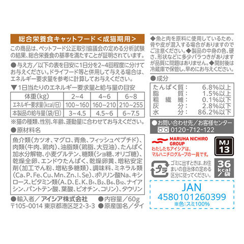 | ご注意 | ※本品は成猫用です。対象年齢以外の猫には与えないでください。 ※肉と魚を原料に使用しているため、骨や皮が混入する場合がありますのでご注意ください。 ※本品の中身の色、硬さ、形状などに多少のバラつきがありますが、品質に問題はありません。 ※開封後は冷蔵庫で保管し、早めにお与えください。 |