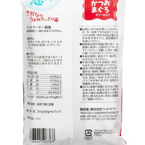 | 特長 | ●さかなのうまみたっぷりの猫用一般食です。 ●かつお、まぐろなどの素材をゼリーに包み込みました。 ●鉄分、ビタミン豊富な血合い肉を使用しました。 |