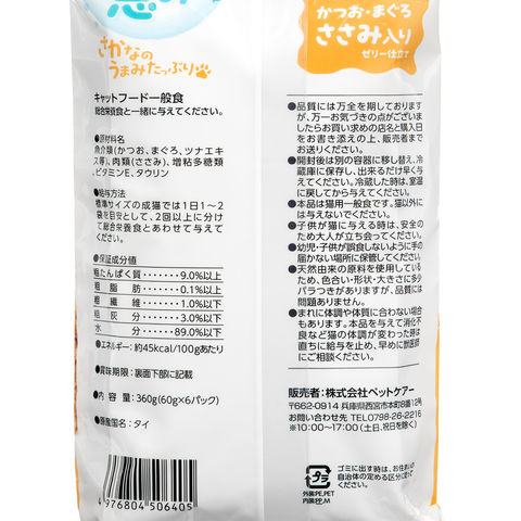| 特長 | ●さかなのうまみたっぷりの猫用一般食です。 ●かつお、まぐろ、ささみなどの素材をゼリーに包み込みました。 |