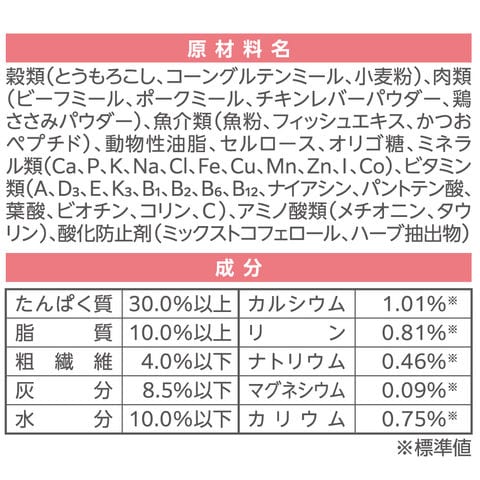 原材料 穀類(とうもろこし、コーングルテンミール、小麦粉)、肉類(ビーフミール、ポークミール、チキンレバーパウダー、鶏ささみパウダー)、魚介類(魚粉、フィッシュエキス、かつおペプチド)、動物性油脂、セルロース、オリゴ糖、ミネラル類(Ca、P、K、Na、Cl、Fe、Cu、Mn、Zn、I、Co)、ビタミン類(A、D3、E、K3、B1、B2、B6、B12、ナイアシン、パントテン酸、葉酸、ビオチン、コリン、C)、アミノ酸類(メチオニン、タウリン)、酸化防止剤(ミックストコフェロール、ハーブ抽出物)