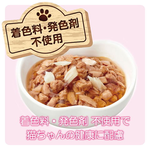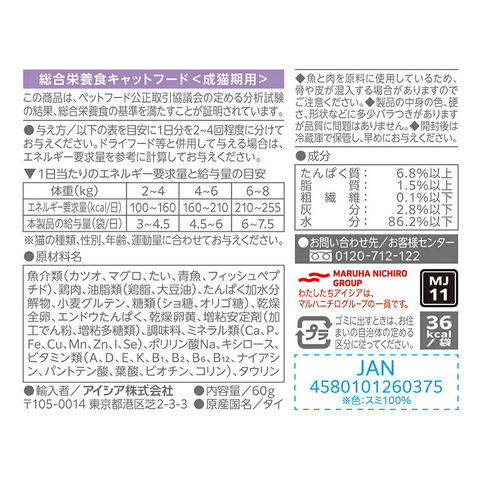| 原材料 | 魚介類(カツオ、マグロ、たい、青魚、フィッシュペプチド)、鶏肉、油脂類(鶏脂、大豆油)、たんぱく加水分解物、小麦グルテン、糖類(ショ糖、オリゴ糖)、乾燥全卵、エンドウたんぱく、乾燥卵黄、増粘安定剤(加工でん粉、増粘多糖類)、調味料、ミネラル類(Ca、P、Fe、Cu、Mn、Zn、I、Se)、ポリリン酸Na、キシロース、ビタミン類(A、D、E、K、B1、B2、B6、B12、ナイアシン、パントテン酸、葉酸、ビオチン、コリン)、タウリン |